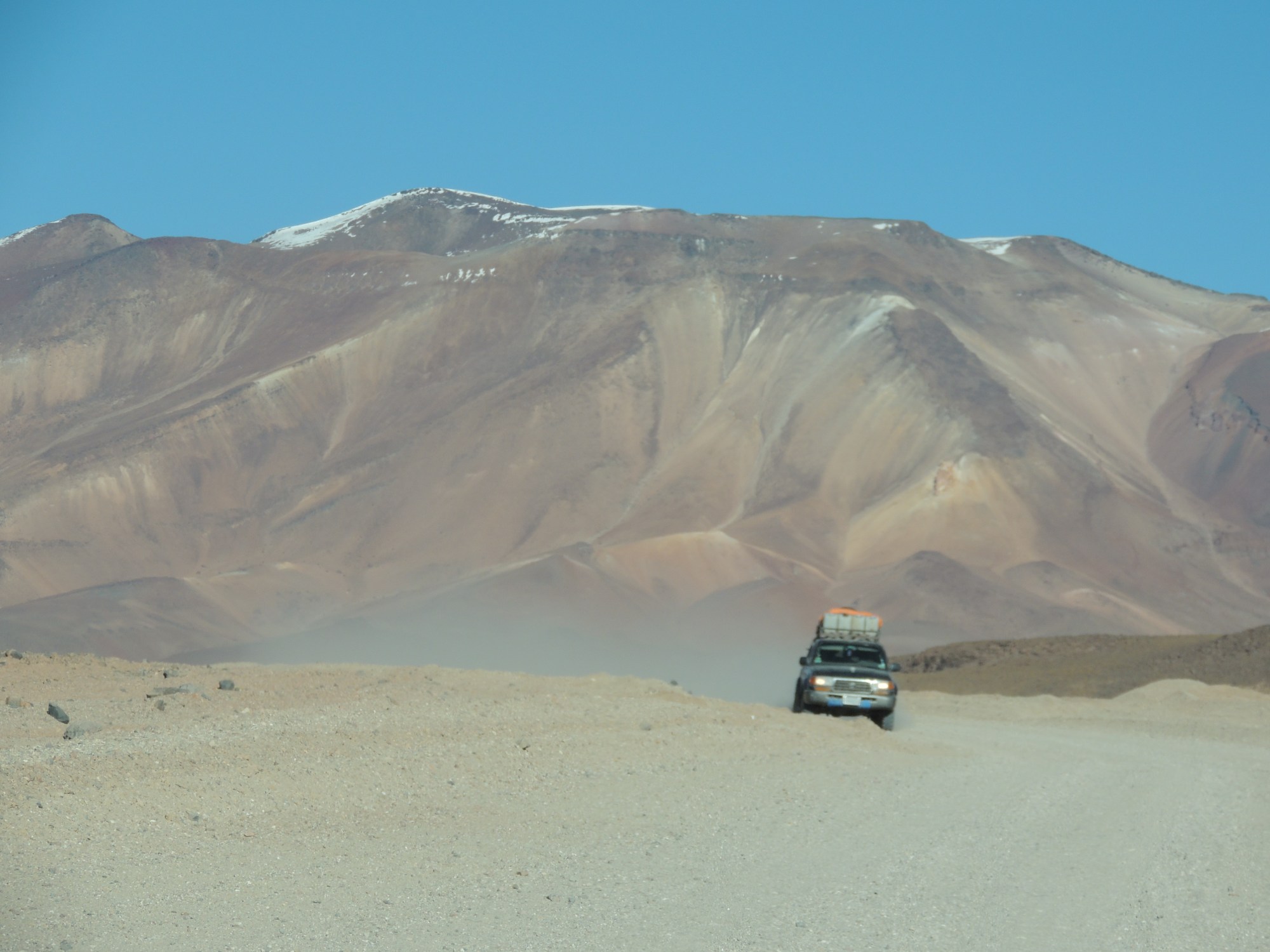 Daar zouden we worden opgewacht door iemand die ons van de bus zou ophalen. Maar er was nadie. En wij hadden honger. Tenslotte hadden wij het diner praktisch overgeslagen (de helft van het meegenomen zakje popcorn ging helaas over de grond) en geen ontbijt mee. Ontbijtzaakjes waren er niet of nauwelijks (zo ver wij hadden gezocht), dus vonden we aansluiting bij de rest van Uyuni, die lekker bij een dame op straat gefrituurde deegstengels zat te eten met een kopje mierzoete chocolademelk. When in Rome, do as Romans do. Nou, hoppetee, oliebollenontbijt. Ondertussen even gebeld over waar we precies heen moesten gaan. Zo gepiept, en onderweg naar het kantoortje van een van de talloze agencies in Uyuni die in tours voorzien. Wij hadden nog 2 uur te doden voor onze tour begon, en hebben ons vermaakt met een 2e ontbijt (met koffie) en een optocht door de lokale kinderen voor de día del niño. Ze hebben hier letterlijk een dag voor alles. Kinderen, chicha, internationals, kerken, je kunt het zo gek niet bedenken of ze vieren er hier op een bepaalde dag een feest voor. En toen waren we onderweg: met een Chileens stel dat later geen stel bleek te zijn en 2 Duitse chicks die erop gebrand waren elke seconde van de weg vast te leggen op camera, liefst in exactemundo dezelfde pose. Onze gids had de orthodoxe naam Joseph en liet geen woord extra los dan het aantal dat hem verplicht werd opgelegd door zijn functie. Van de 4 Européos in de auto, was ik de enige die Spaans sprak. So far, so good.